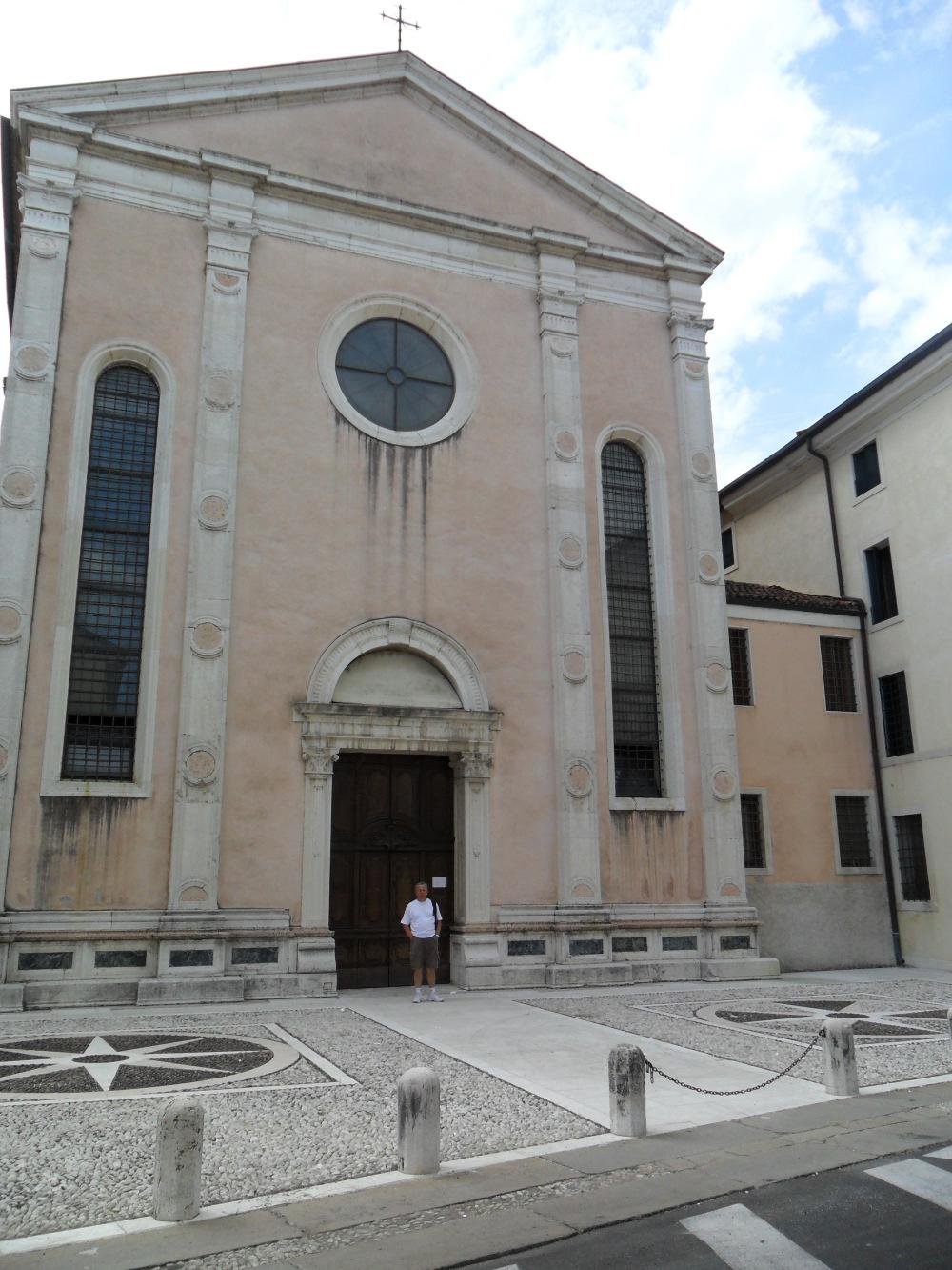 Fachada da Igreja de San Rocco, em Vicenza, Itália. Em frente à porta de entrada da igreja está Mauro da Cunha Naghettini, descendente de Nicola Naghettini e Appolonia Gallio. A foto foi tirada em 2011, durante sua visita à província italiana de Vicenza.