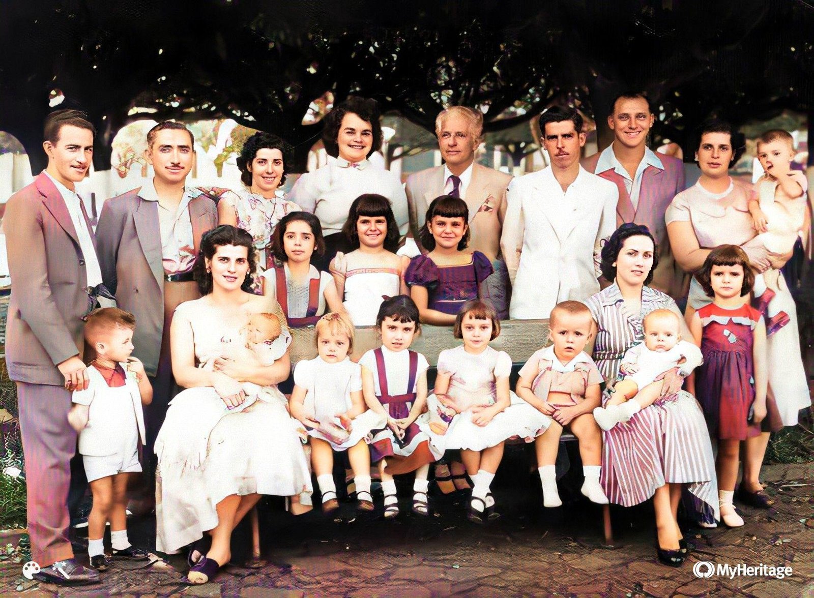 Família de Gigeto, em 1958. Atrás, em pé, da esquerda para a direita: João Bragato (marido de Adair), Sebastião (marido de Geny), Geny (filha de Gigeto), Almira (segunda esposa de Gigeto), Gigeto, Nilo (filho de Gigeto), Álfio Valente (marido de Ginete), Ginete (filha de Gigeto) e seu filho Reginaldo, no colo. No meio, em pé, da esquerda para a direita, Ronaldo (filho de Adair), Ieda (filha de Geny), Maria do Carmo, Suely e Maria das Graças (filhas de Gigeto e Almira). À frente, sentados, da esquerda para a direita: Adair (filha de Gigeto) e seu filho Ronan, no colo, Rejane (filha de Ginete), Leda (filha de Geny), Regina (filha de Ginete), Mauro (filho de Nilo), Agostinha (esposa de Nilo) e seu filho Marcos, no colo. Consta na foto, no canto inferior direito, a logo do site de genealogia: My Heritage.