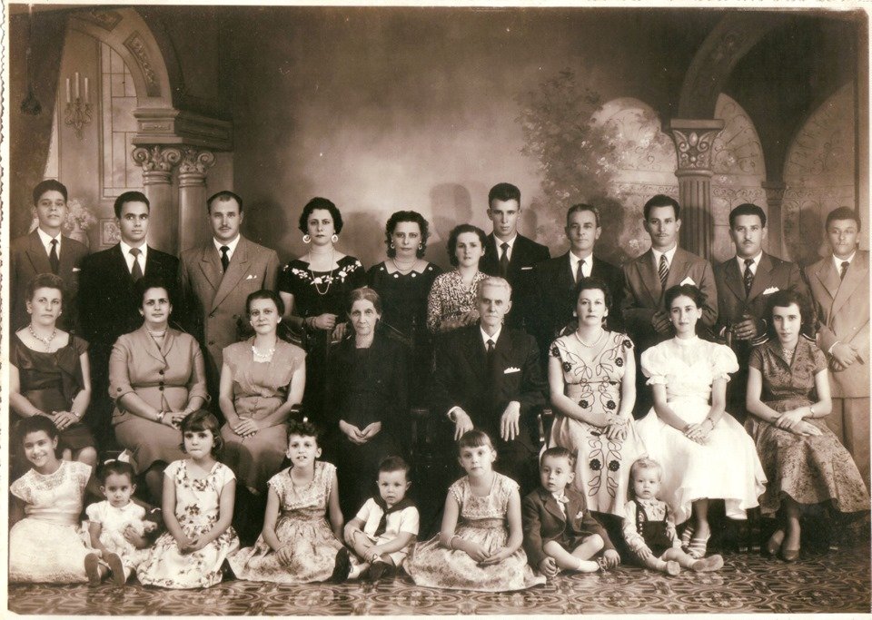 Foto com o título de Família Landri Macedo, datada de 1955, em Alfenas. Possivelmente se refere à família constituída por Maria Angelina Landri ("Sinhá"), filha de Candido Landri e Maria Raffaela, que se casou com José Delphino de Macedo.