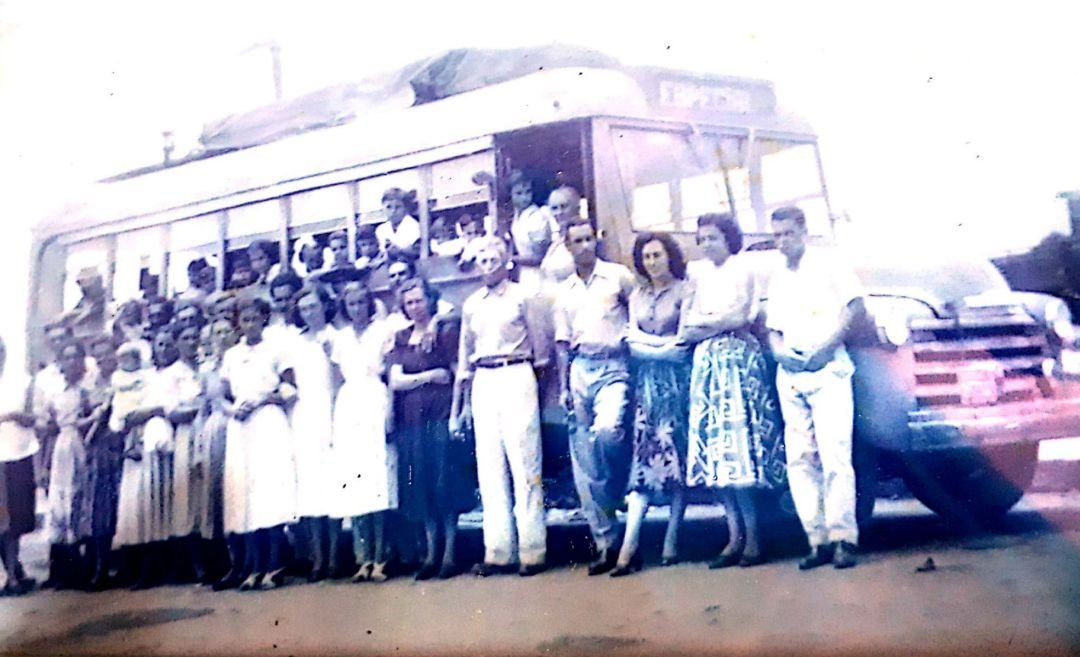 Família Piva, agregados e amigos, em viagem a Aparecida, na década de 1950. Celso Piva é identificado como o primeiro menino na janela frontal, da direita para a esquerda. O grupo encontra-se posicionado diante de um ônibus do tipo “jardineira”, com bagageiros externos. Observa-se a presença de diversas crianças no interior do veículo, com as cabeças projetadas pelas janelas.