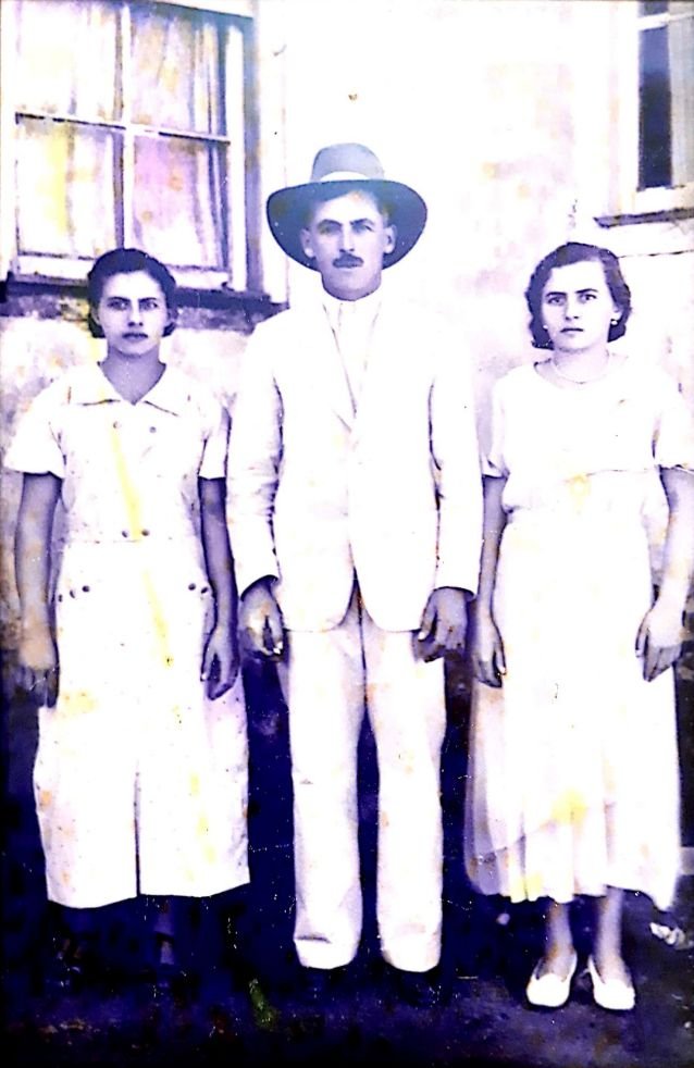 Ferdinando Piva retratado com duas de suas filhas, em registro fotográfico realizado em frente a uma residência. Ferdinando traja calça comprida e paletó em tonalidade clara, portando chapéu. As filhas vestem trajes de cor clara.