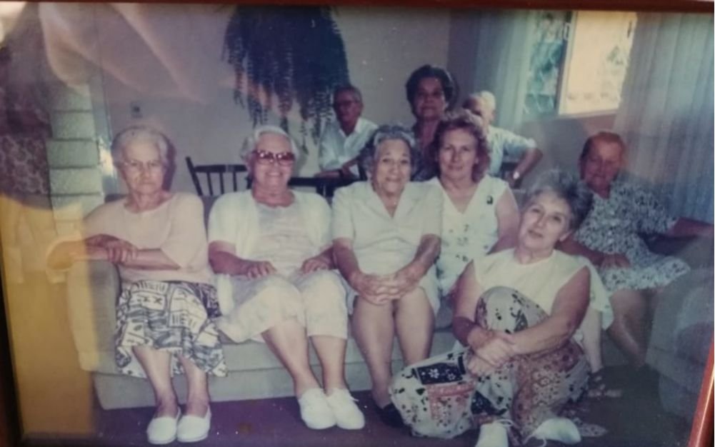 Filhas, filhos, noras e genros de Ferdinando Piva reunidos em registro fotográfico. Consta anotação de Elaine Piva informando que, à época de seu comentário, infelizmente quase todos os retratados já eram falecidos. A imagem integra artigo de autoria de Elaine Piva, publicado em agosto de 2024.
