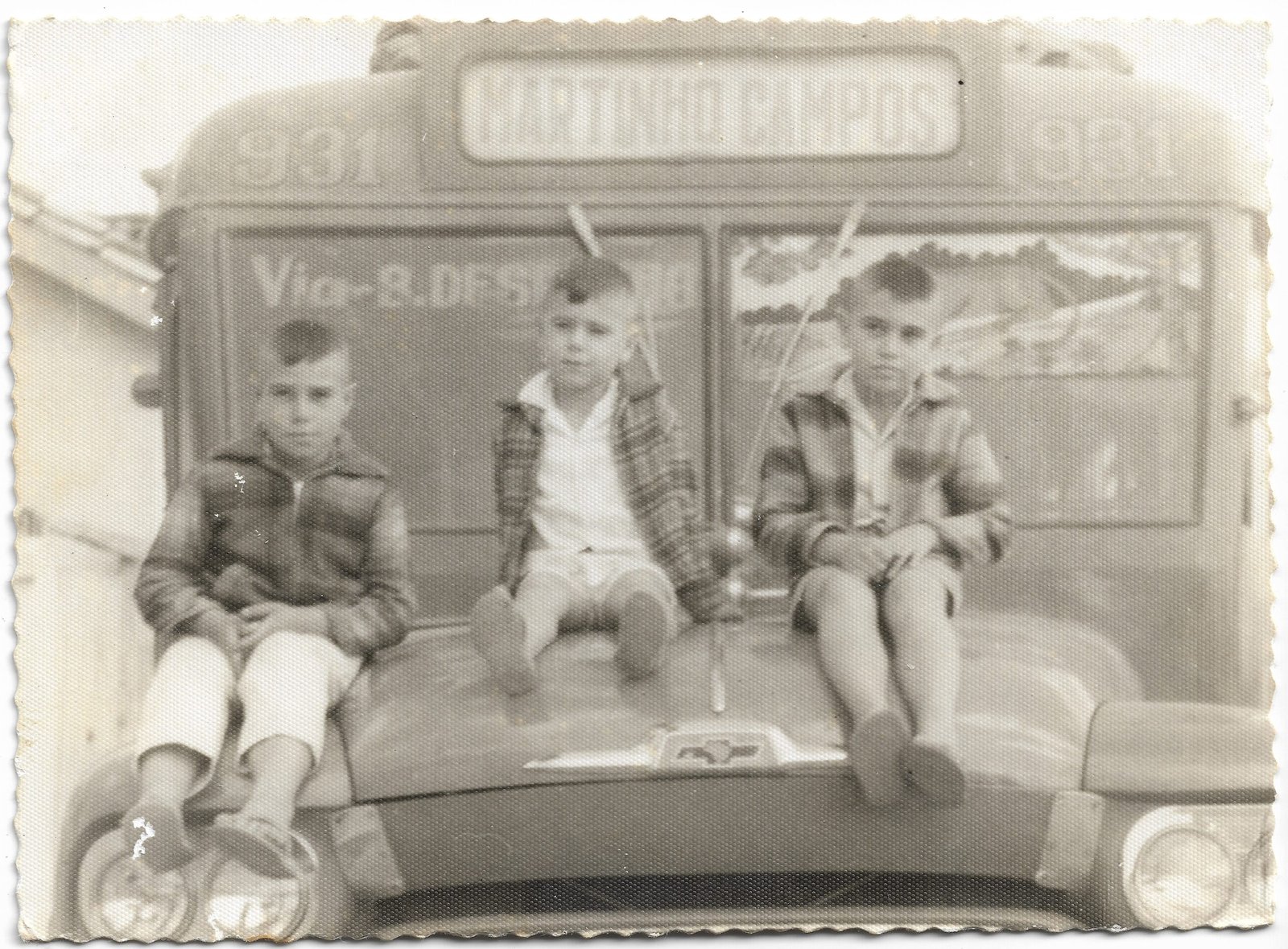 Filhos de José Daldegan sentados no capô de uma jardineira (ônibus antigo) com a inscrição “Martinho Campos” e o número “931” na parte frontal, indicando provável trajeto ou local de origem/destino.