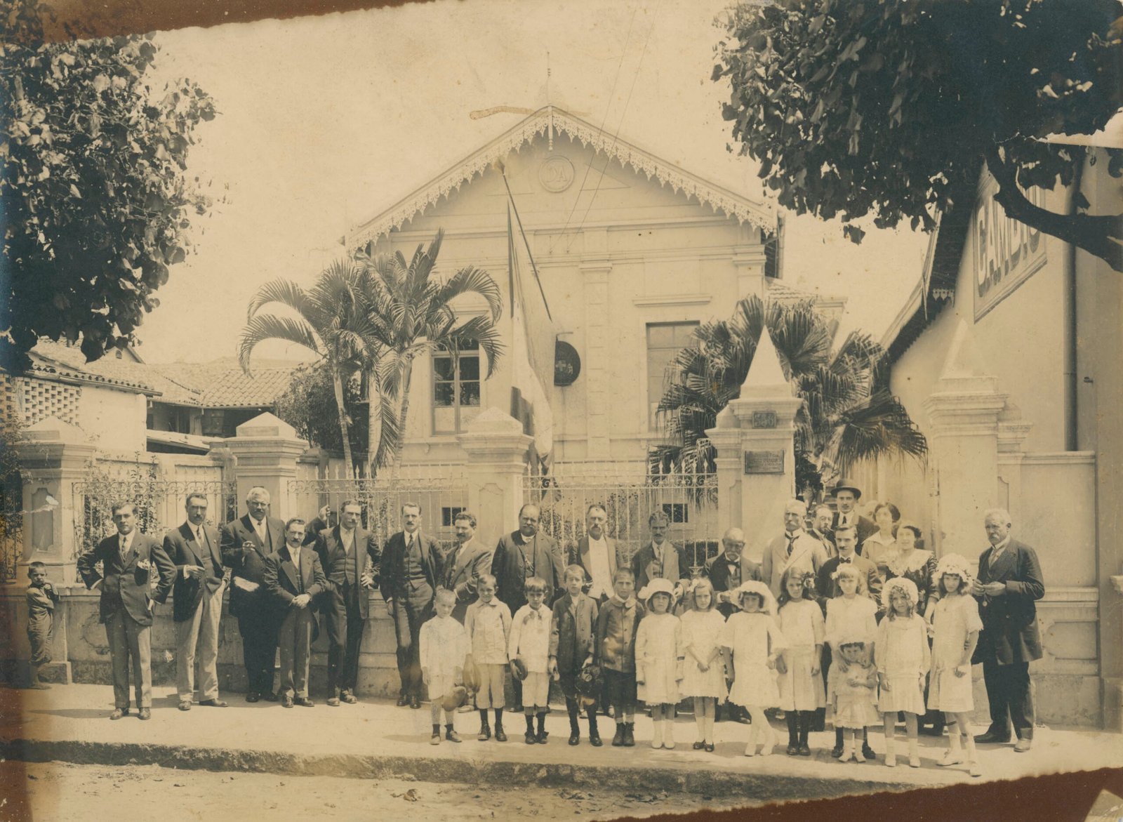 Registro fotográfico de grupo posicionado em frente a uma agremiação italiana, sem identificação do local. Fotografia de autoria de Igino Bonfioli, doada por Anísio Ciscotto.