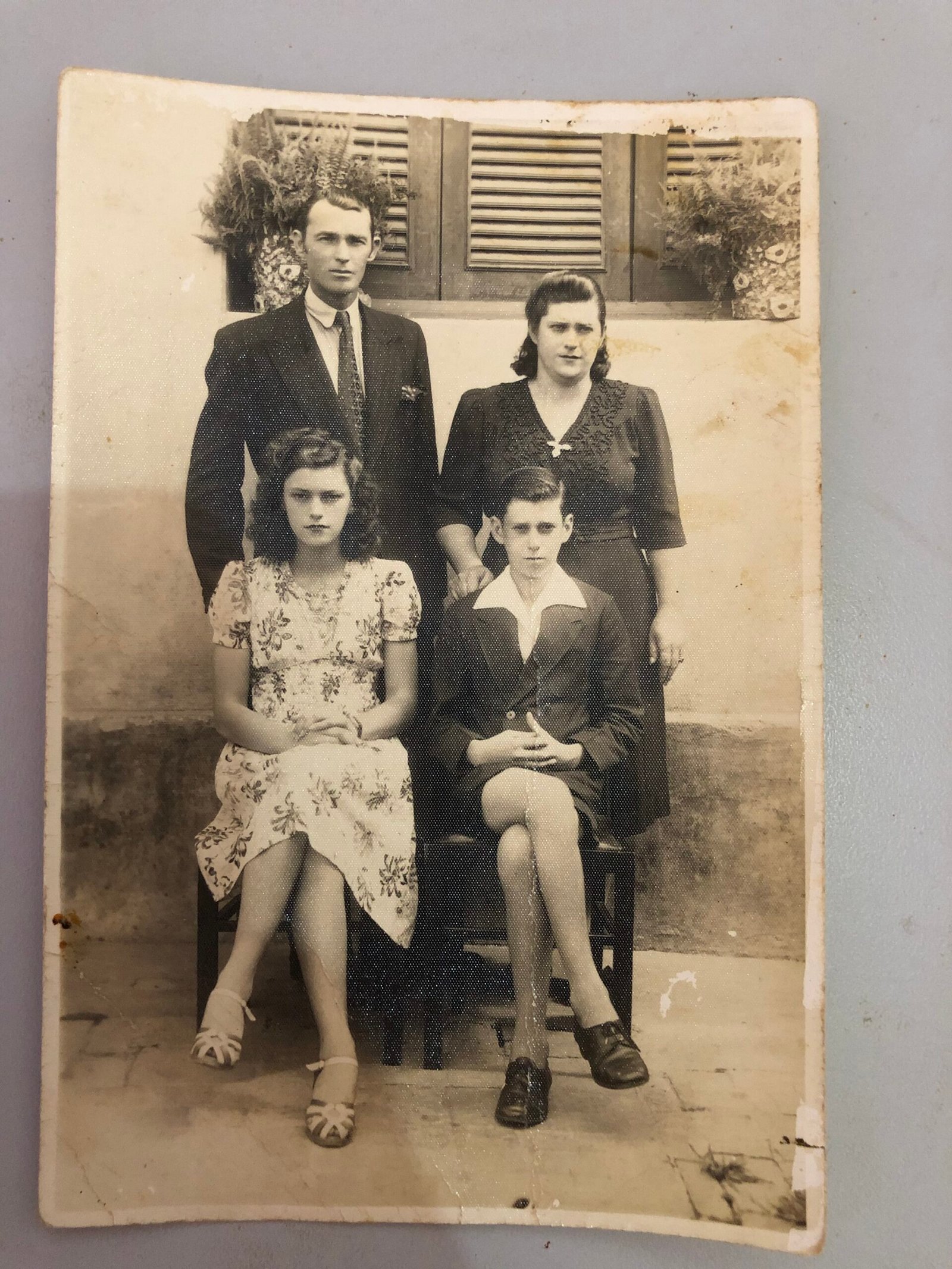 Anotações no álbum de Família: "Família de Luigi Dal Degan, não identificado". Casal em pé atrás de uma jovem e um adolescente sentados no que parece ser a frente de uma casa.