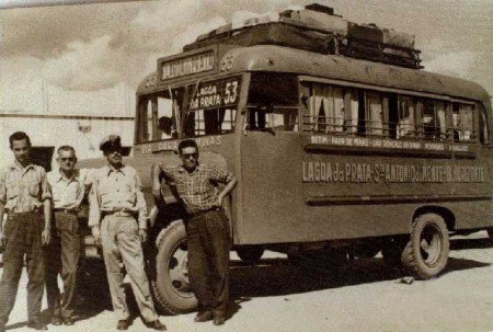 Jardineira da empresa São Cristóvão, criada por Antonio Daldegan, em 1957. O ônibus está com a inscrição “Lagoa da Prata” e o número “53” na parte frontal, indicando provável trajeto ou local de origem/destino. O itinerário "Lagoa da Prata-Sto Antonio do Monte-B. Horizonte" (Lagoa da Prata - Santo Antônio do Monte - Belo Horizonte) consta na lateral do veículo.