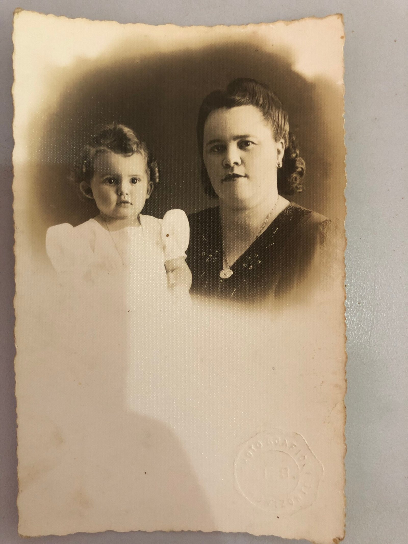 Referência:BONFIOLI, Igino. [Jovem senhora com criança no colo]. Belo Horizonte, Minas Gerais, [19--]. 1 fotografia, p/b. Acervo da Família Daldegan.