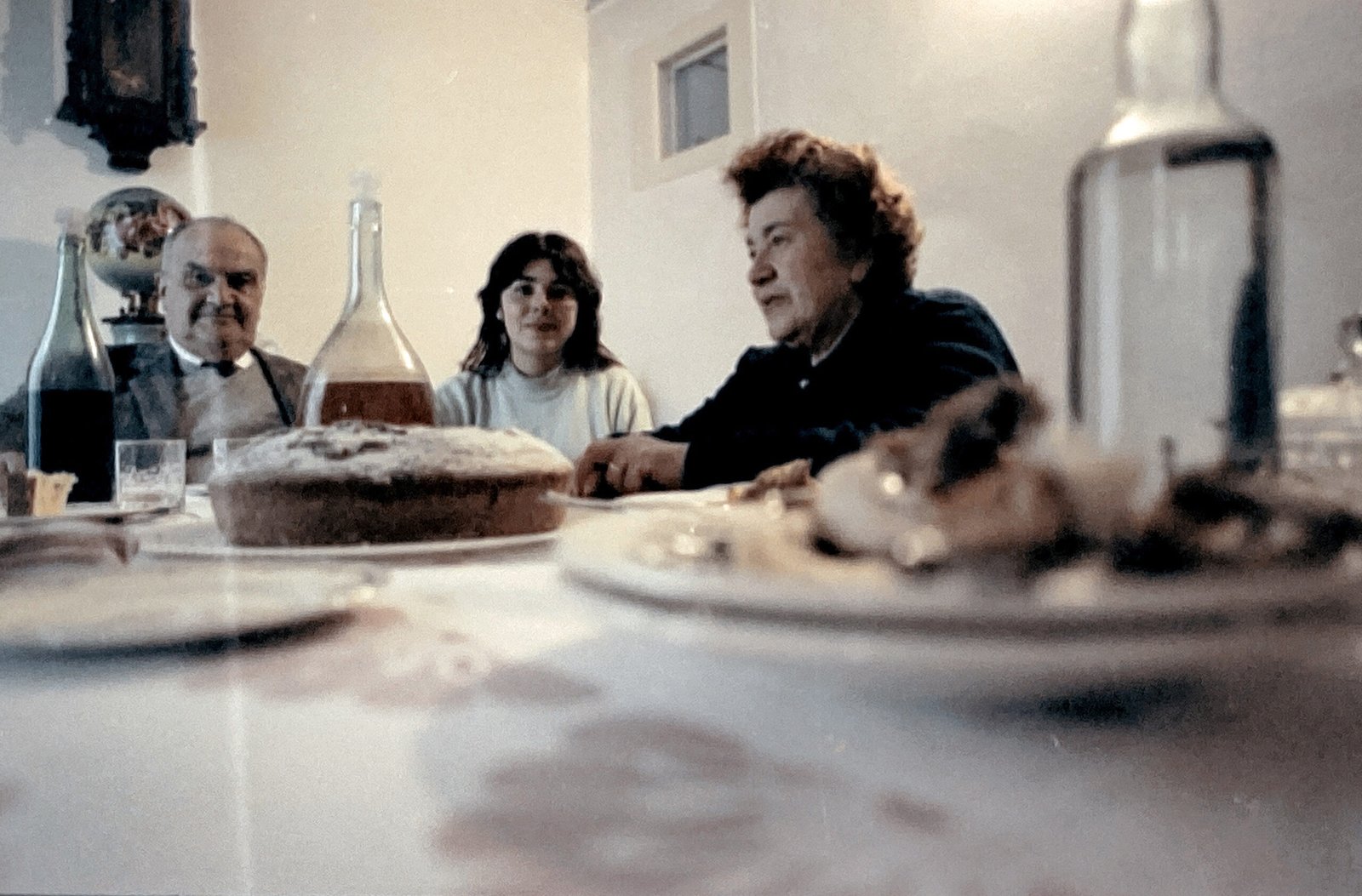 Kátia Lombardi ao lado dos tios-avós Ennio Lombardi e Ida, durante visita aos parentes, em Buonabitacolo, em 1990.
