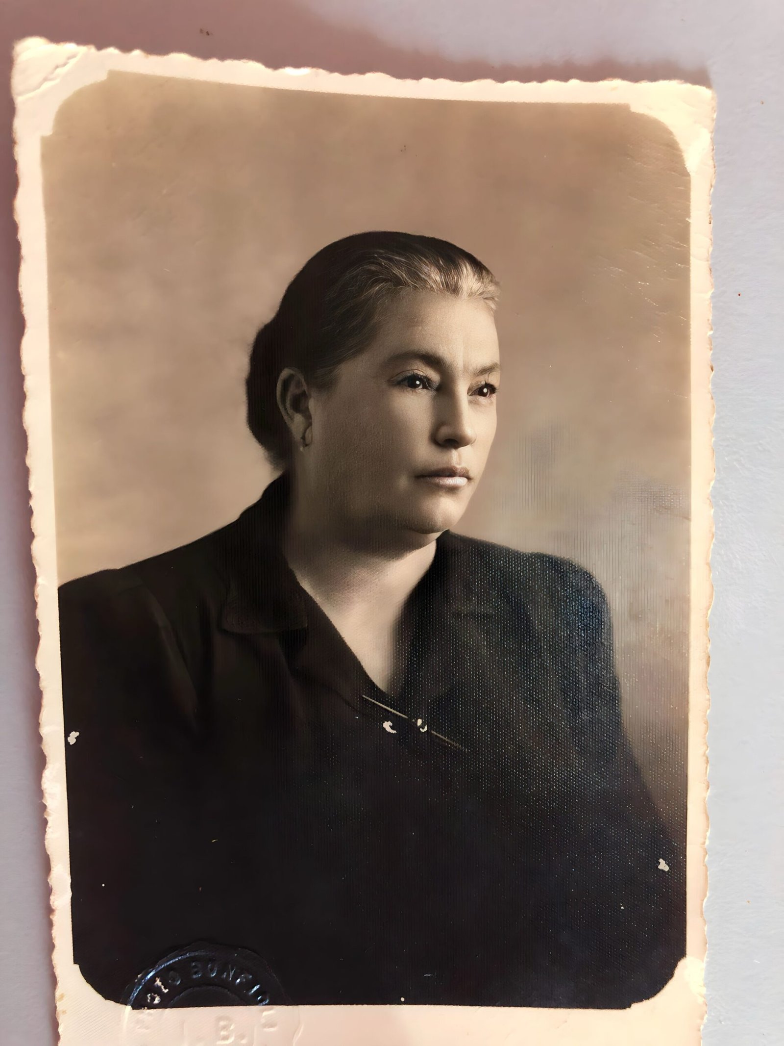 Anotações no álbum de Família: "Luigia Sottana - Luiza Sotane. Esposa de Luigi Dal Degan". Senhora com roupa escura e coque na cabeça. Foto capturada em estúdio fotográfico. No canto inferior esquerdo consta o carimbo do provável fotógráfo Bonfioli e, o local: Belo Horizonte.