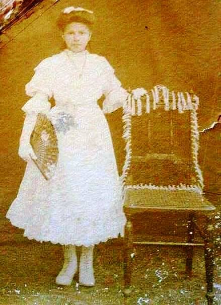 Maria Landri em Alfenas, em 1913. A foto parece ter sido colorizada. A menina está vestida de branco, de pé, uma das mãos apóia a cadeira e a outra, segura um leque aberto.