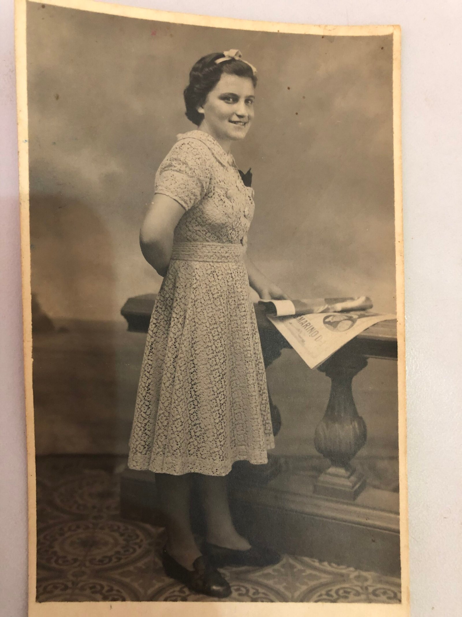 Anotações no álbum de Família: "Família de Luigi Dal Degan, não identificado". Moça com vestido de renda claro com laço de fita no cabelo, folheando um encarte de jornal ou revista.