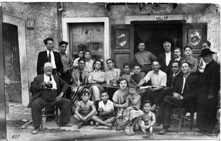 Giuseppe e Ennio Lombardi identificados como os rapazes de camisa branca, com moradores, sentados em frente a um estabelecimento comercial em Buonabitacolo.