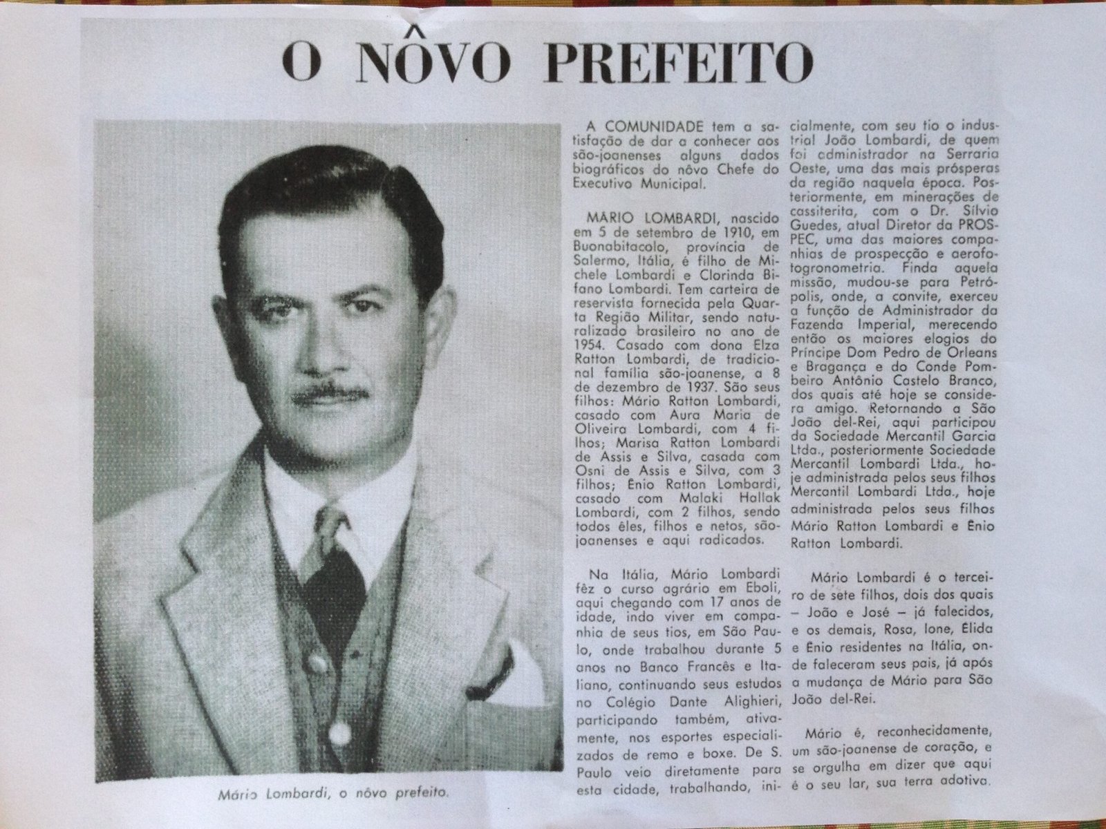 Referência:[O NOVO prefeito, Mario Lombardi]. A Comunidade: órgão da Prefeitura Municipal de São João del-Rei, ano 4, n. 30, p. 3, jan. 1971. Recorte de Jornal.