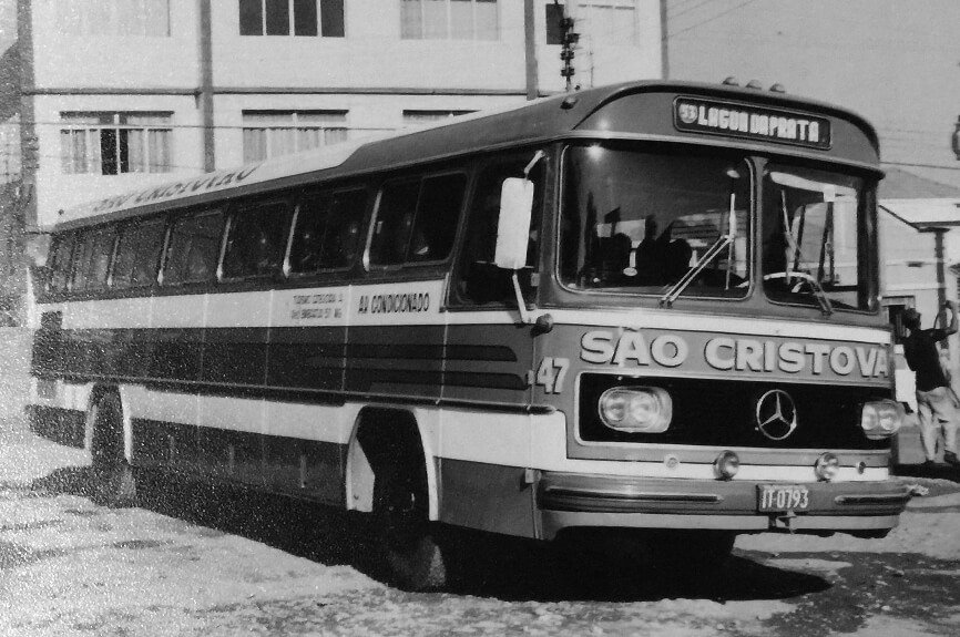 Fotografia de ônibus da Viação São Cristóvão, com a inscrição “53 Lagoa da Prata”, indicando trajeto ou local de origem/destino. A empresa, sediada em Divinópolis (MG), foi criada por Antonio Daldegan em 1957. Na lateral do veículo consta a indicação de ar condicionado. O modelo do ônibus é identificado como Mercedes-Benz O-362, fabricado na década de 1970.