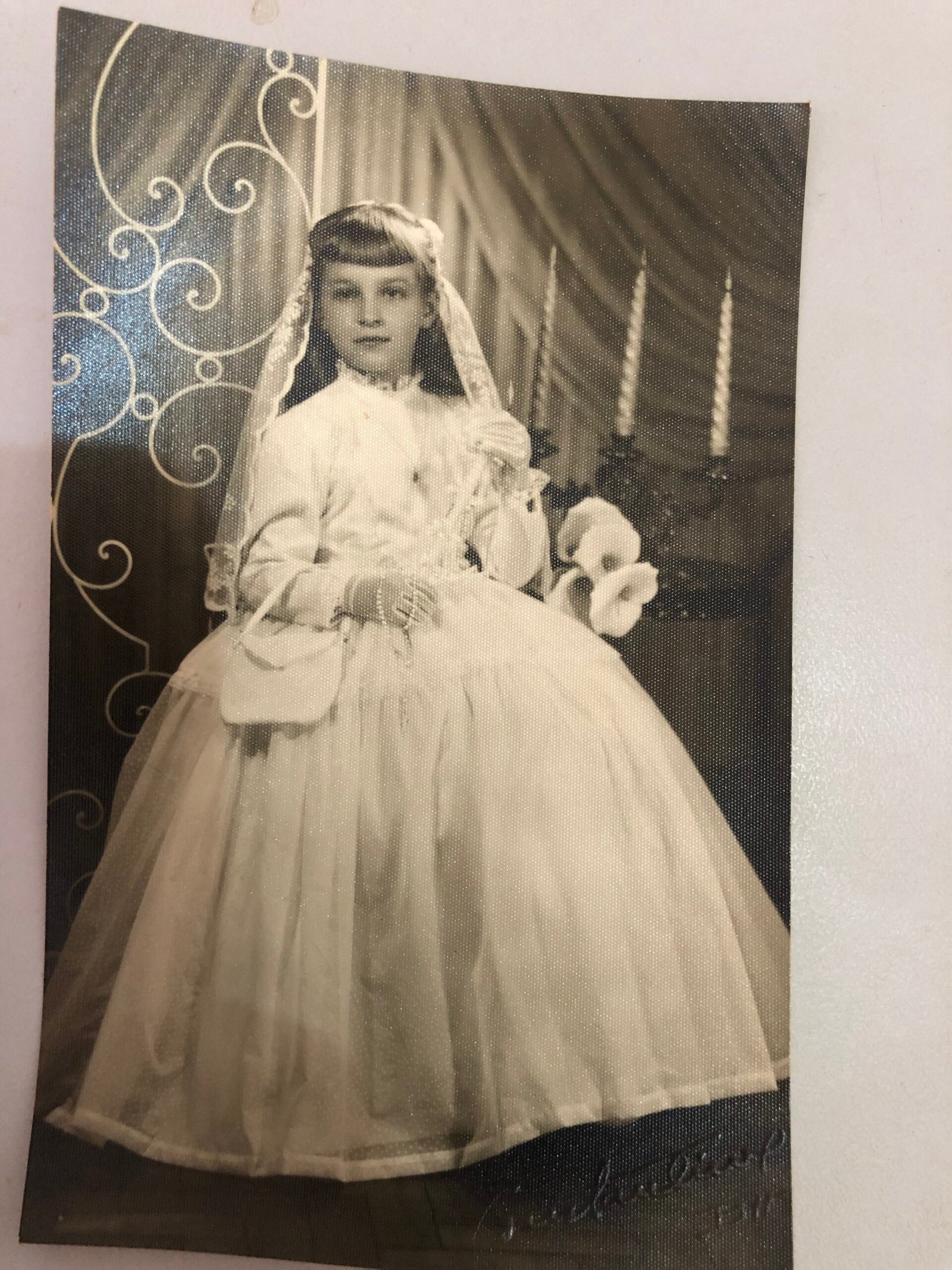 Anotações no álbum de Família: "Família de Luigi Dal Degan, não identificado. Foto de primeira comunhão, mostra intensa fé católica da família". Criança com véu, bolsa, luvas, flores e vestida de branco. Carrega um terço na mão esquerda. A mão direita segura uma vela. Ao fundo cortinas e velas. Foto capturada em estúdio fotográfico.No canto inferior direito consta a assinatura do provável fotográfo: [Constantino] - BH.