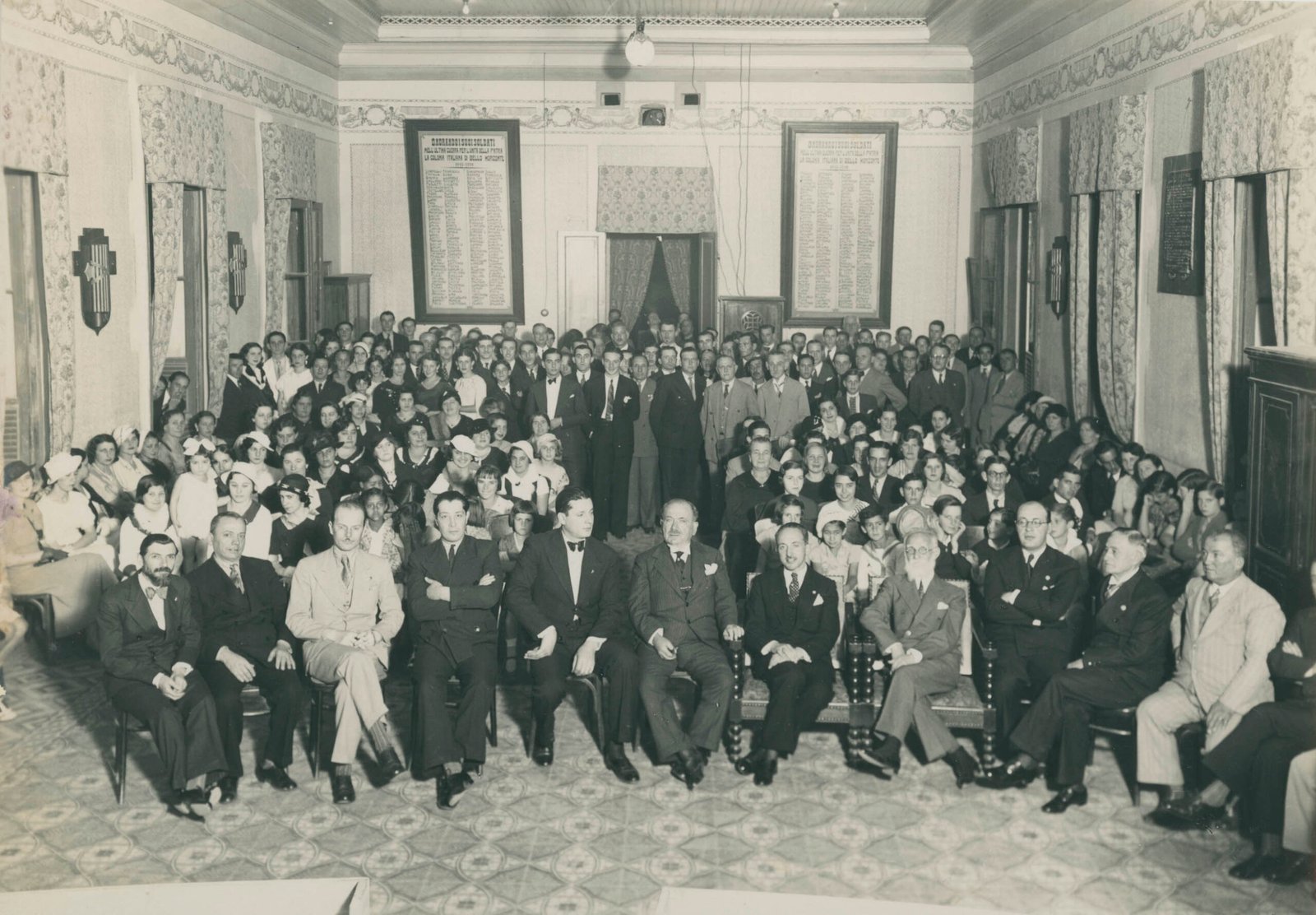 Registro fotográfico de reunião realizada no salão da Casa d’Italia, com provável presença do cônsul Tullio Grazioli. Datação estimada entre 1934 e 1938. Fotografia de autoria de Igino Bonfioli, doada por Anísio Ciscotto.