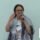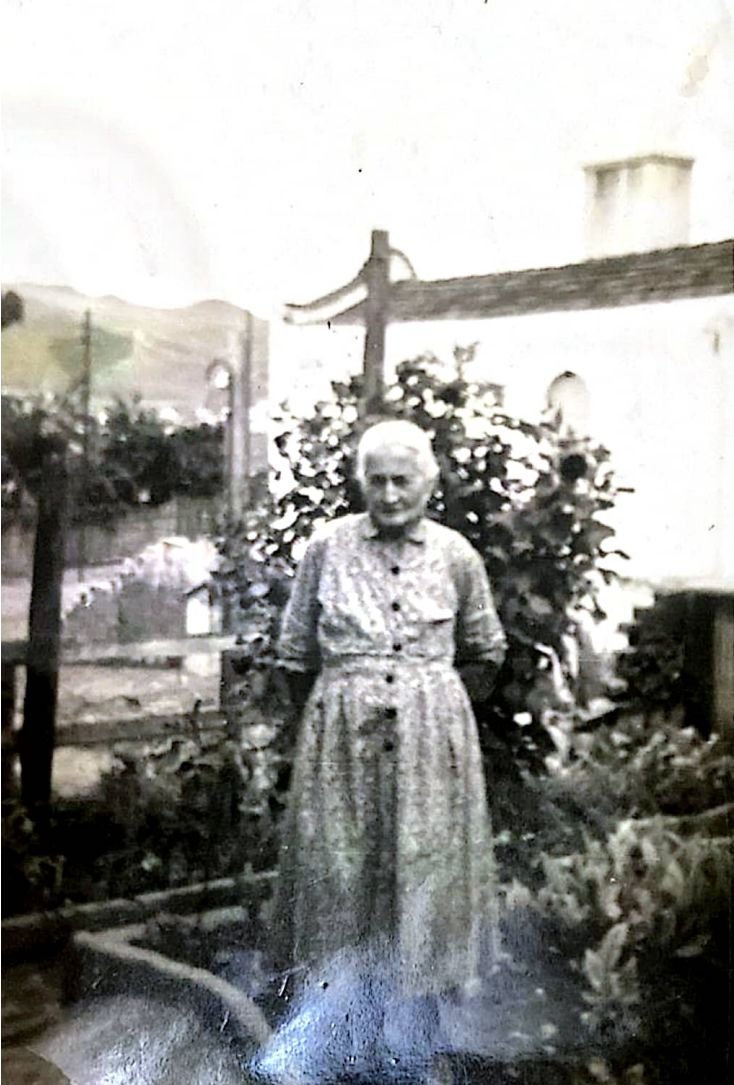 Rosa Metti, esposa de Sante Piva e trisavó de Elaine Piva, registrada já em idade avançada, em ambiente ajardinado, trajando vestido estampado.