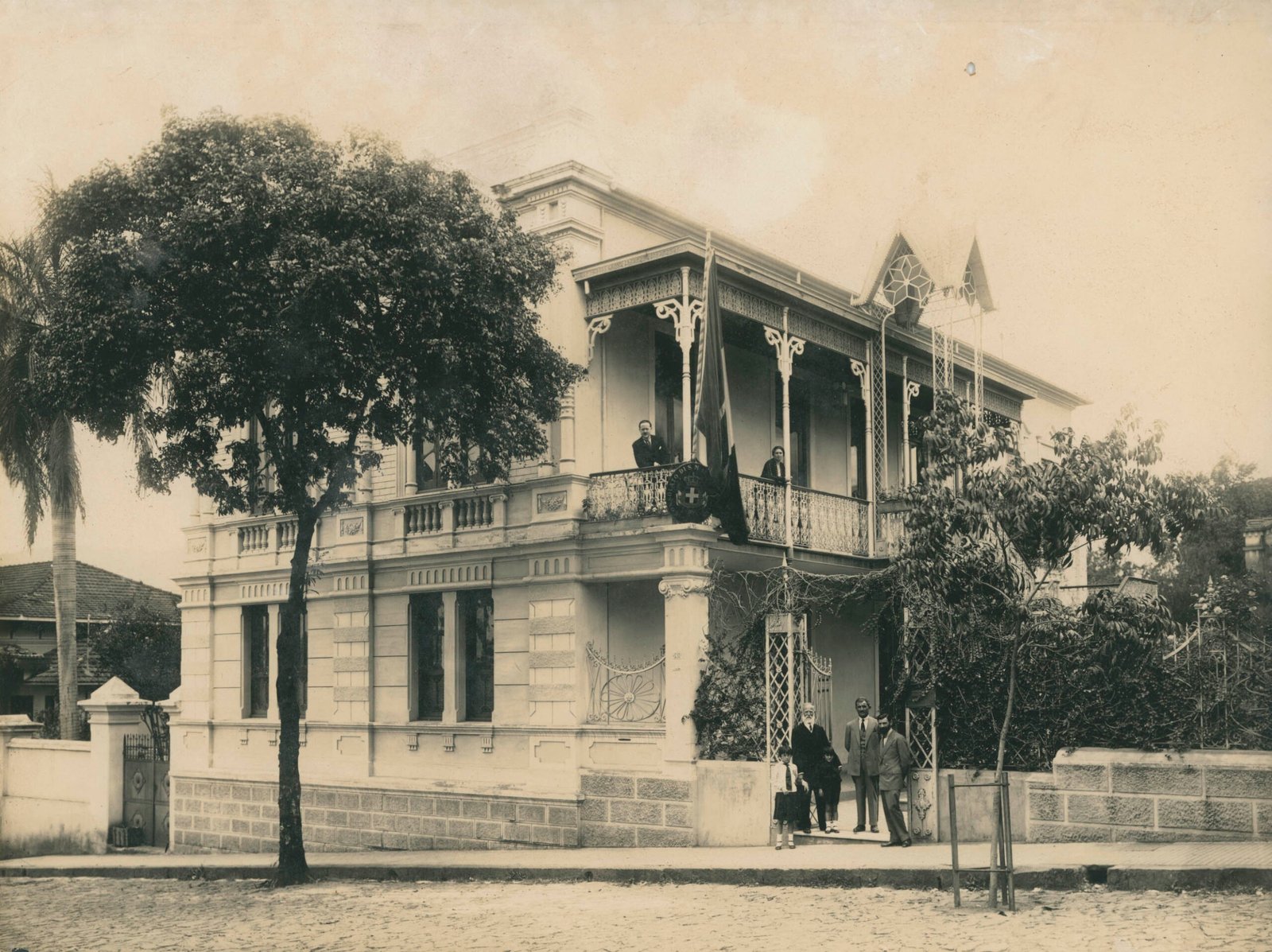 Vista da segunda sede do Consulado da Itália, localizada na Rua dos Aimorés, com datação estimada entre 1928 e 1932. Na varanda do edifício encontra-se o cônsul Lorenzo Nicolai, e, junto ao portão, o vice-cônsul Belli di Sardis. Fotografia de autoria de Igino Bonfioli, doada por Anísio Ciscotto.