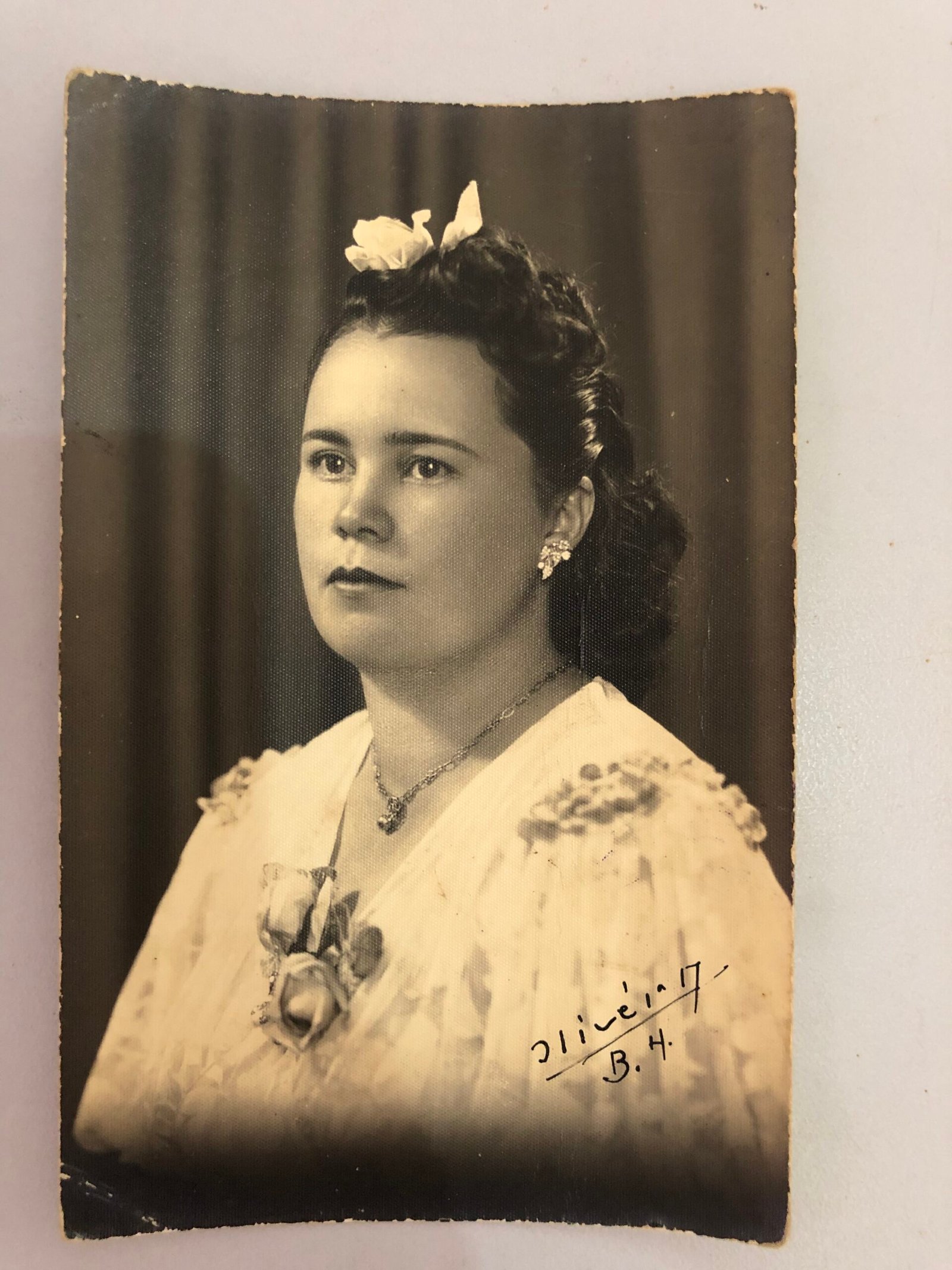 Anotações no álbum de Família: "Família de Luigi Dal Degan, não identificado". Foto de senhora elegantemente vestida com colar e brincos, capturada em estúdio fotográfico. No canto inferior direito consta a assinatura (ilegível) do provável fotógrafo [Oliveira?] e, o local: Belo Horizonte.