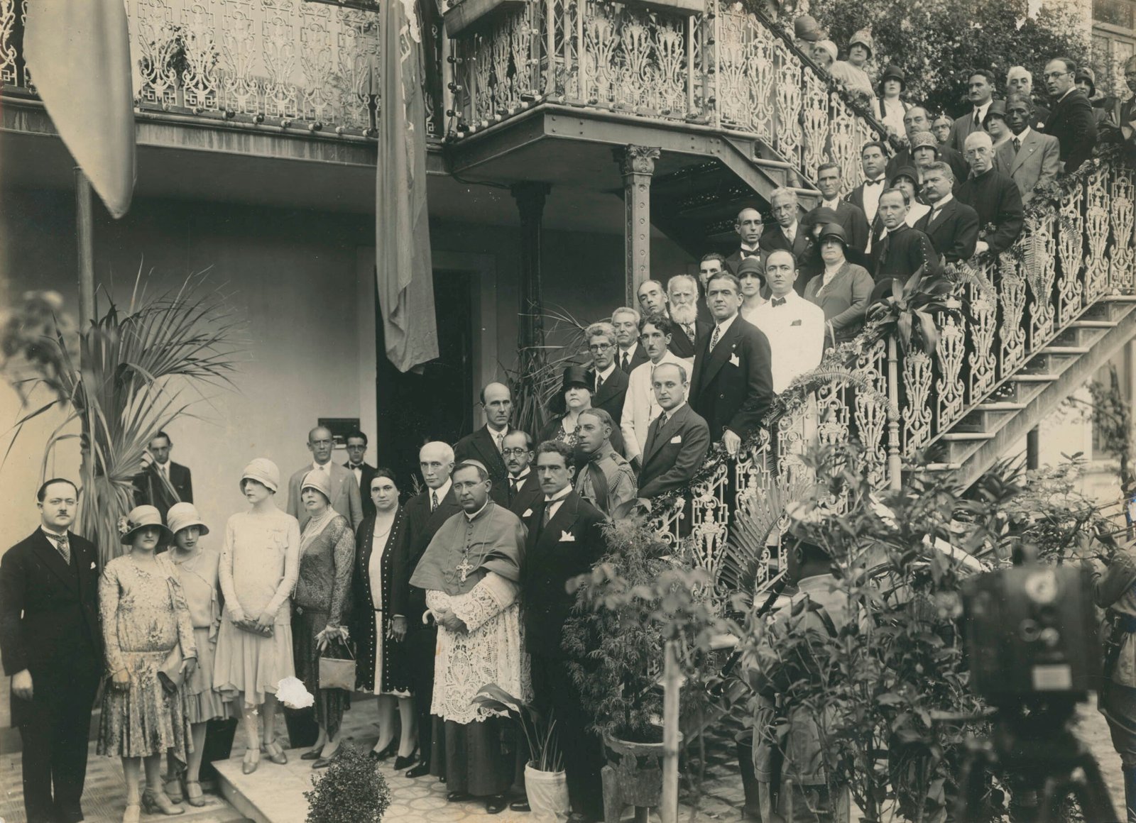 Registro fotográfico de solenidade realizada em frente à sede do Consulado da Itália, situada na Rua dos Aimorés, em Belo Horizonte , em 11 de novembro de 1932, com a presença do arcebispo Antônio dos Santos Cabral. Fotografia de autoria de Igino Bonfioli, doada por Anísio Ciscotto.