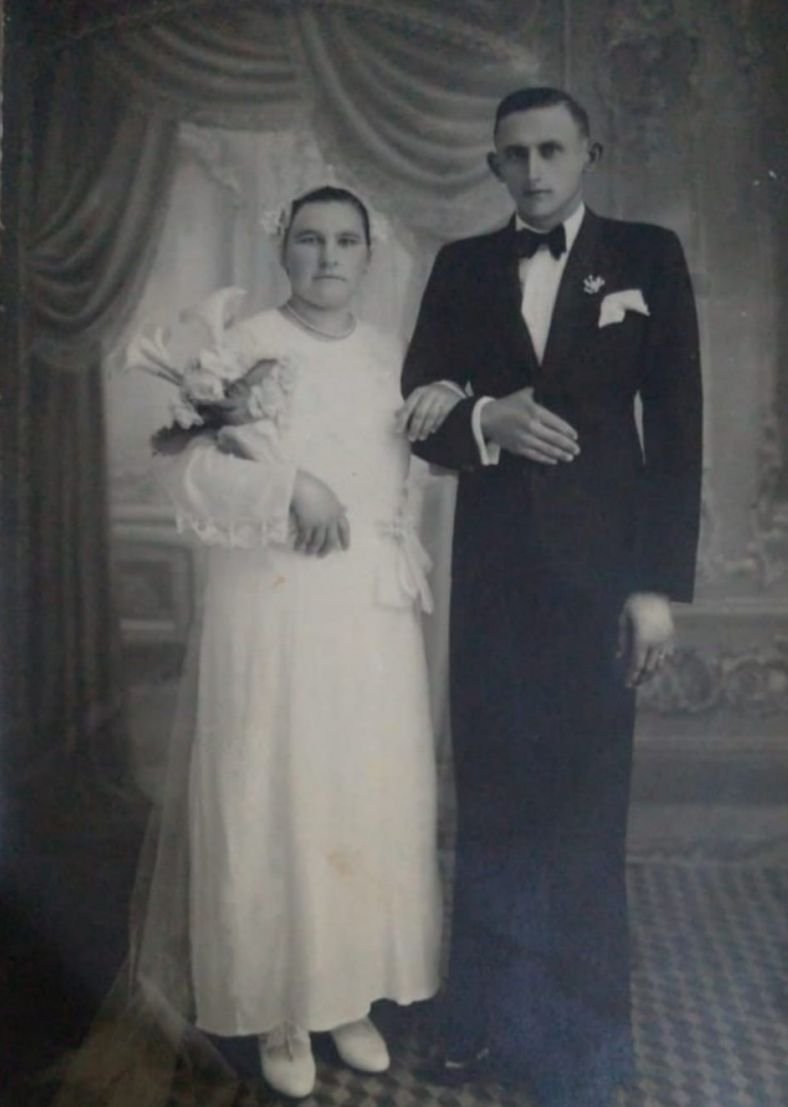 Foto tradicional do casamento de Santo Piva e Maria Zanette em Poços de Caldas, provavelmente na década de 40 do século XX.