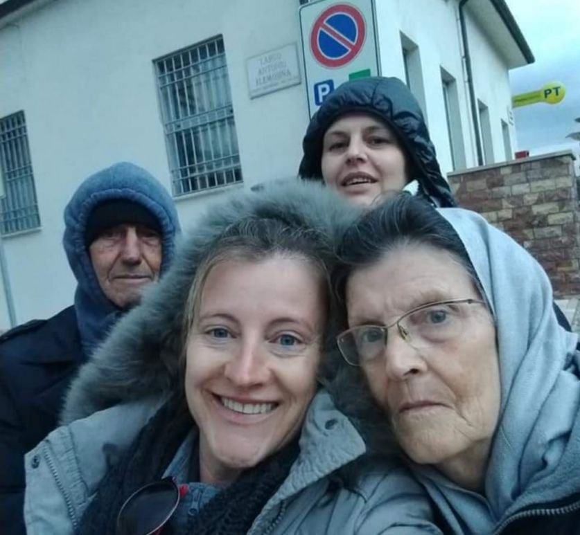 Registro fotográfico do tipo “selfie”, realizado por Elaine Piva, ao lado da mãe. Ao fundo, encontram-se o pai e a irmã. A imagem foi produzida em frente a uma residência localizada em Monfumo.