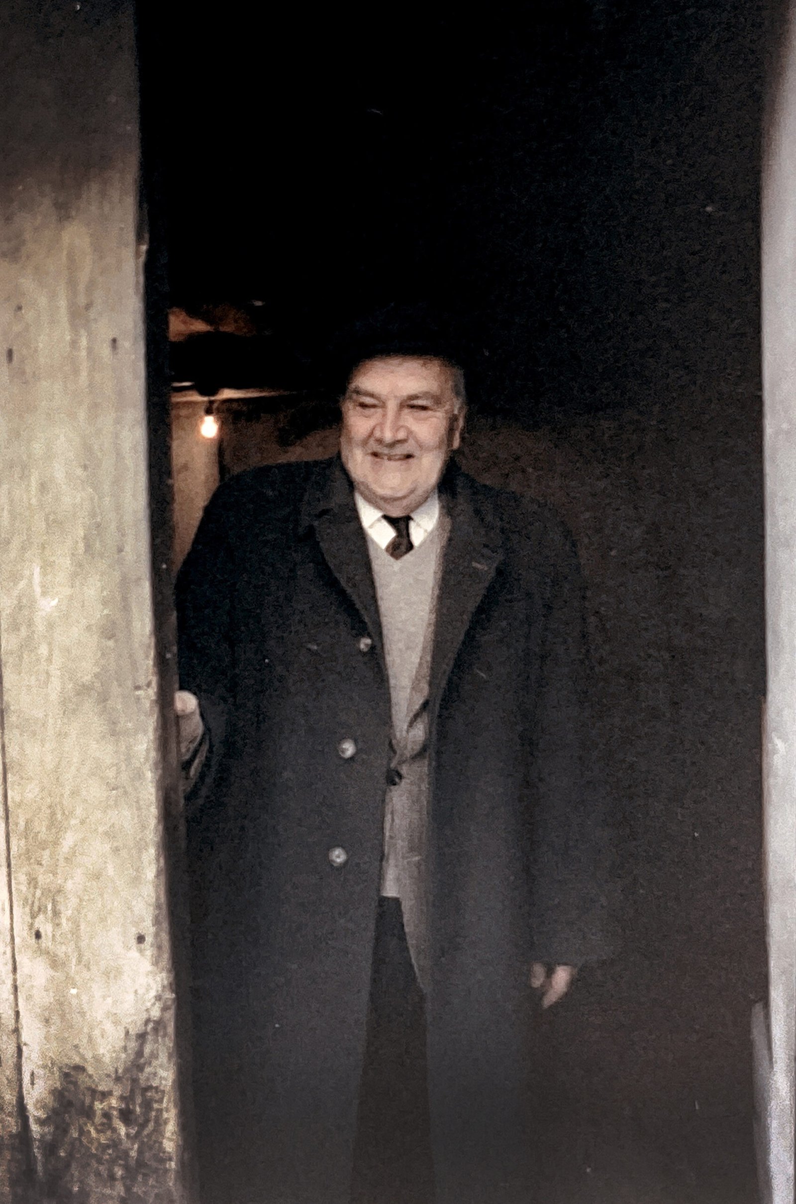 Ennio Lombardi, irmão de Mario Lombardi, com um sobretudo escuro, em uma residência em Buonabitacolo.