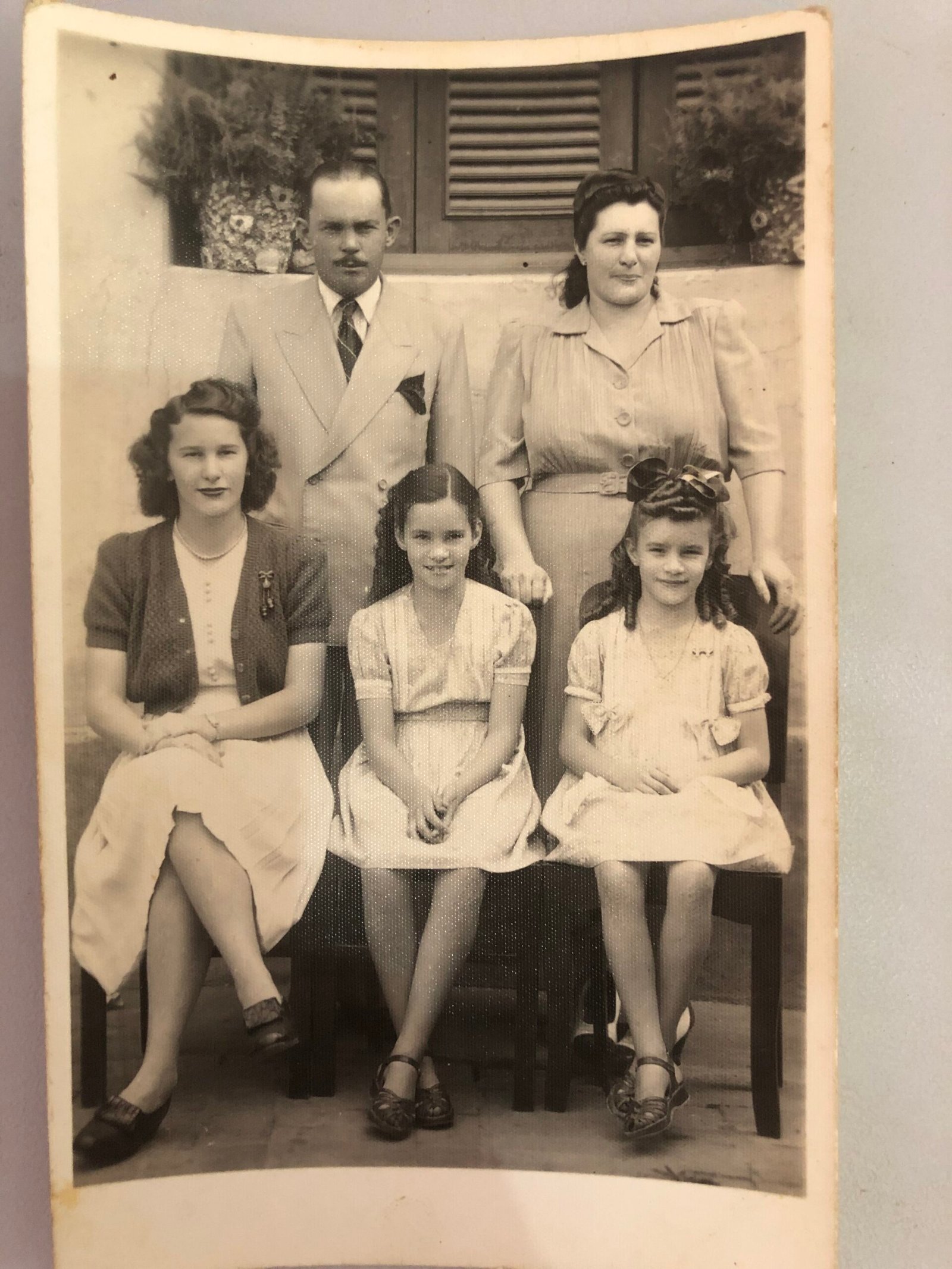 Anotações no álbum de Família: "Família de Luigi Dal Degan, não identificado". Casal em pé e, sentadas à frente, uma jovem e duas meninas. Foto parece ter sido tirada em frente a uma casa.