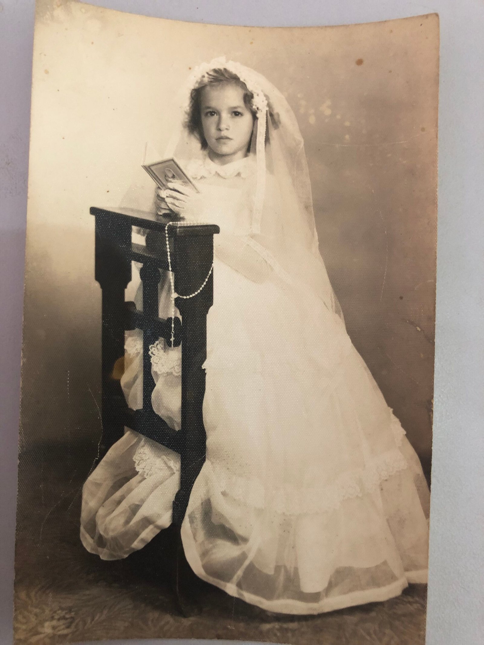 Anotações no álbum de Família: "Família de Luigi Dal Degan, não identificado. Foto de primeira comunhão, mostra intensa fé católica da família". Menina com cerca de 8 anos de idade, vestida de branco, com luvas e véu, sentada de lado ou ajoelhada em um genuflexório. O terço está no móvel de madeira.