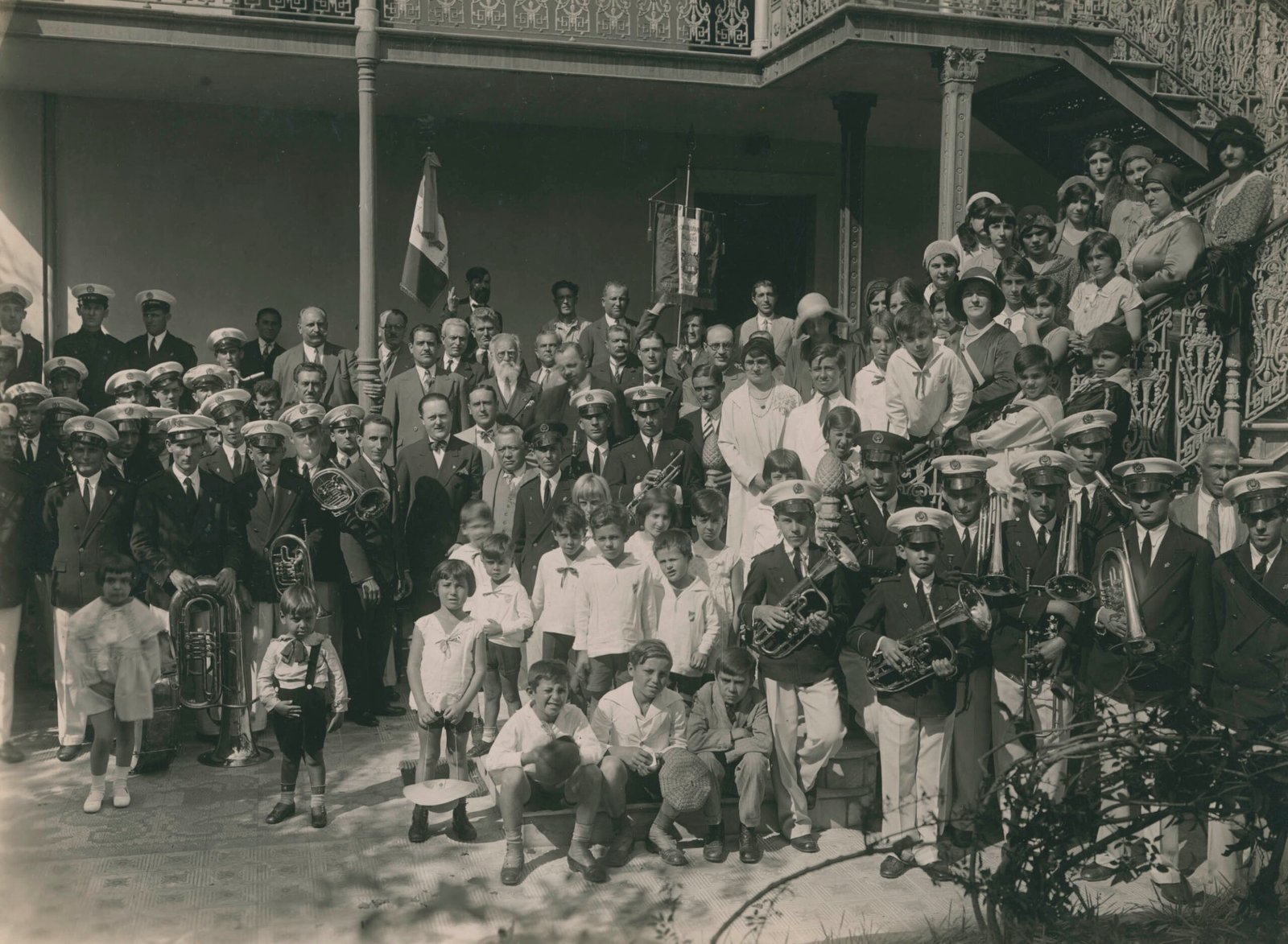 Registro fotográfico de solenidade realizada em frente à sede do Consulado da Itália, situada na Rua dos Aimorés, em Belo Horizonte , em 11 de novembro de 1932. Fotografia de autoria de Igino Bonfioli, doada por Anísio Ciscotto.